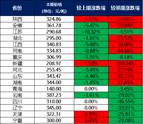 分價格區(qū)間來看,本期兩堿工業(yè)鹽單價在300元/噸及以上的地區(qū)有12個,分別是陜西、安徽、江西、河南、重慶、山東、湖南、云南、四川、遼寧、天津、寧夏;兩堿工業(yè)鹽單價在300元/噸以下的地區(qū)有5個,分別是江蘇、湖北、新疆、河北、青海。