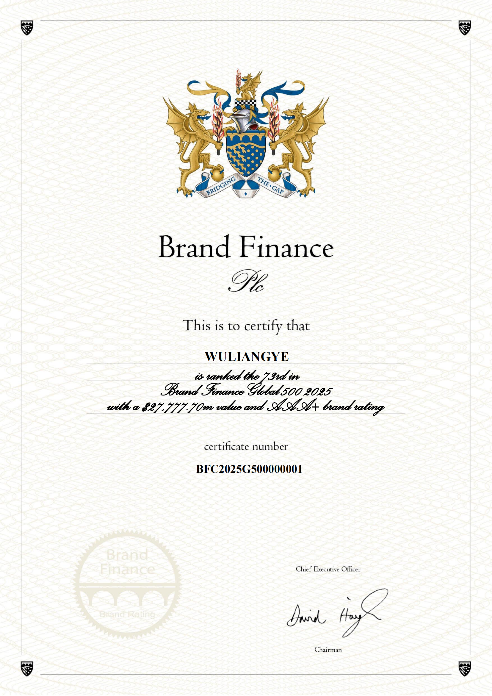 Brand Finance 2025年全球品牌價(jià)值500強(qiáng)榜單報(bào)告顯示,五糧液品牌強(qiáng)度評(píng)級(jí)繼續(xù)保持全球最高等級(jí)——AAA+級(jí),品牌價(jià)值達(dá)277.78億美元,同比增長7.27%,排名上升2位至第73名。