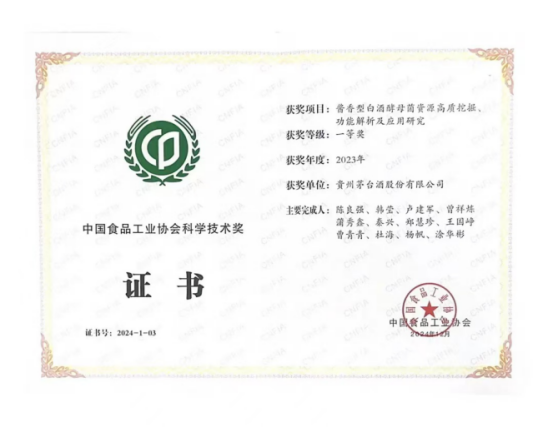 茅臺(tái)酒股份公司科創(chuàng)成果獲中國食品工業(yè)協(xié)會(huì)科學(xué)技術(shù)獎(jiǎng)一等獎(jiǎng)