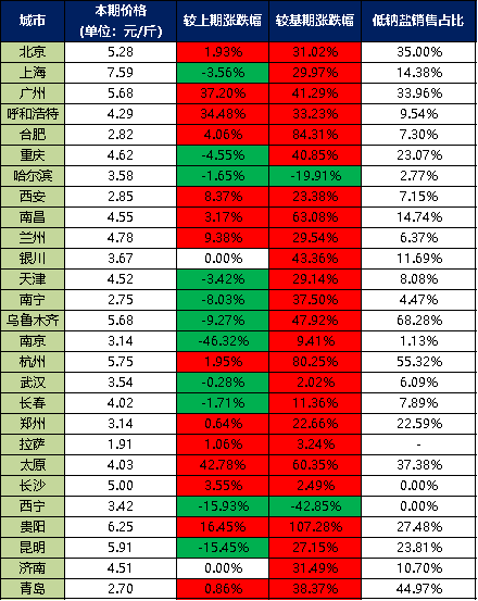 分價(jià)格區(qū)間來看,本期超市食用鹽銷售單價(jià)在5元/斤以上的城市有7個(gè),分別是北京、上海、廣州、烏魯木齊、杭州、貴陽、昆明;超市食用鹽銷售單價(jià)在4-5元/斤之間的城市有9個(gè),分別是呼和浩特、重慶、南昌、蘭州、天津、長(zhǎng)春、太原、長(zhǎng)沙、濟(jì)南;超市食用鹽銷售單價(jià)在3-4元/斤之間的城市有6個(gè),分別是哈爾濱、銀川、南京、武漢、鄭州、西寧;超市食用鹽銷售單價(jià)在3元/斤以下的城市有5個(gè),分別是合肥、西安、南寧、拉薩、青島。