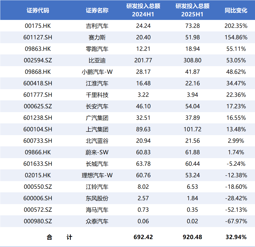 在乘用車市場競爭激烈之際,上市車企正試圖在盈利水平與研發(fā)投入之間找到平衡點。同花順iFinD數(shù)據(jù)顯示,截至9月2日,已披露的18家上市車企(A股+H股)今年上半年研發(fā)投入(費用化研發(fā)支出+資本化研發(fā)支出)合計920.48億元,同比增長32.94%。受車企盈利能力等因素影響,車企研發(fā)投入強度出現(xiàn)分化,納入統(tǒng)計的18家車企中,12家車企的研發(fā)投入同比實現(xiàn)正增長,占比為66.67%,吉利汽車(00175.HK)、賽力斯(601127.SH)、零跑汽車(09863.HK)等公司研發(fā)投入同比增幅居前,而長城汽車(601633.SH)、理想汽車(02015.HK)等車企研發(fā)投入同比減少。