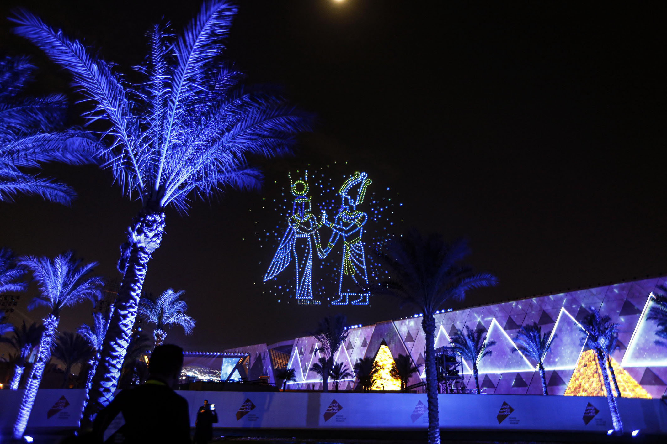 圖為在埃及吉薩拍攝的開(kāi)館儀式上的無(wú)人機(jī)表演和燈光秀。