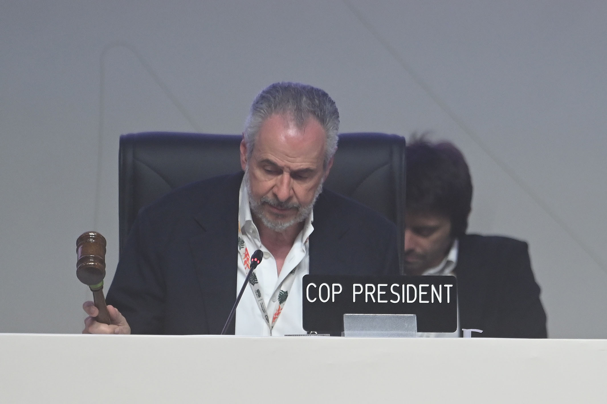 圖為在《聯(lián)合國(guó)氣候變化框架公約》第三十次締約方大會(huì)上,大會(huì)主席多拉戈敲槌確認(rèn)會(huì)議決定。新華社發(fā)(盧西奧·塔沃拉 攝)