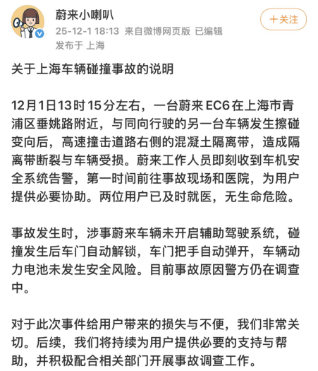 12月1日18時許,蔚來汽車官方辟謠微博號“蔚來小喇叭”發(fā)布事故說明:12月1日13時15分左右,一臺蔚來EC6在上海市青浦區(qū)垂姚路附近,與同向行駛的另一臺車輛發(fā)生擦碰變向后,高速撞擊道路右側(cè)的混凝土隔離帶,造成隔離帶斷裂與車輛受損。蔚來工作人員即刻收到車機(jī)安全系統(tǒng)告警,第一時間前往事故現(xiàn)場和醫(yī)院,為用戶提供必要協(xié)助。兩位用戶已及時就醫(yī),無生命危險(xiǎn)。
