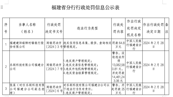 記者還注意到,樂(lè)刷支付曾被中國(guó)人民銀行福建省分行處以高達(dá)2754.38萬(wàn)元的罰款。中國(guó)人民銀行福建省分行行政處罰決定顯示,2024年2月28日,樂(lè)刷支付福建分公司因違反商戶管理規(guī)定、違反交易信息管理規(guī)定、違反外包機(jī)構(gòu)管理規(guī)定、違反資金結(jié)算管理規(guī)定,被給予警告,沒(méi)收違法所得1308.26萬(wàn)元,并處罰款1446.12萬(wàn)元,合計(jì)罰沒(méi)約2754.38萬(wàn)元。