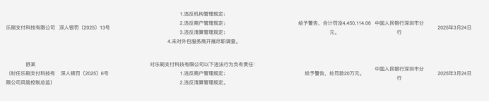 此前,3月24日,根據(jù)中國(guó)人民銀行深圳市分行另一行政處罰決定,樂(lè)刷支付因違反機(jī)構(gòu)管理規(guī)定、違反商戶管理規(guī)定、違反清算管理規(guī)定,以及未對(duì)外包服務(wù)商開(kāi)展盡職調(diào)查,被給予警告,并合計(jì)罰沒(méi)445萬(wàn)元。