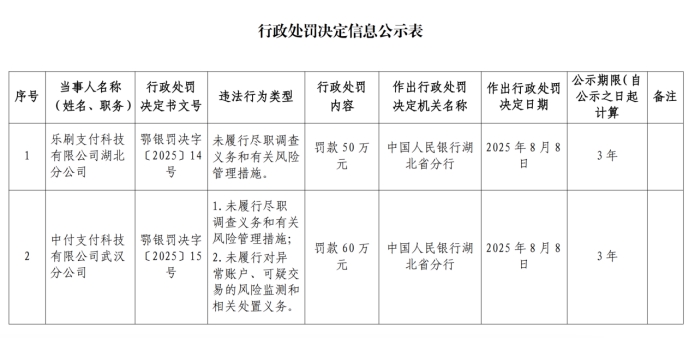 除此之外,今年8月8日,根據(jù)中國(guó)人民銀行湖北省分行行政處罰決定,樂(lè)刷支付湖北分公司因未履行盡職調(diào)查義務(wù)和有關(guān)風(fēng)險(xiǎn)管理措施,被罰款50萬(wàn)元。