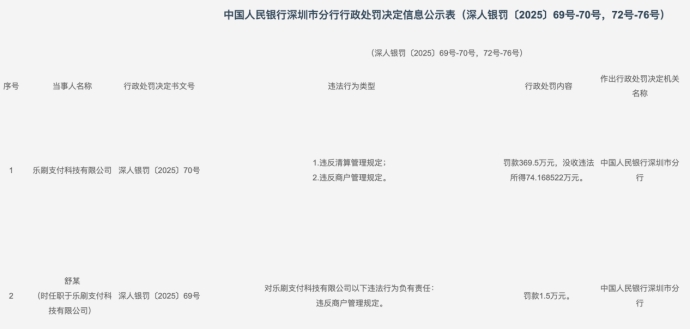 處罰信息顯示,樂(lè)刷支付因違反清算管理規(guī)定和違反商戶管理規(guī)定,被處以罰款369.5萬(wàn)元,并沒(méi)收違法所得74.168522萬(wàn)元。同時(shí),時(shí)任職于該公司的舒某對(duì)上述違反商戶管理規(guī)定的行為負(fù)有責(zé)任,被處以1.5萬(wàn)元罰款。
