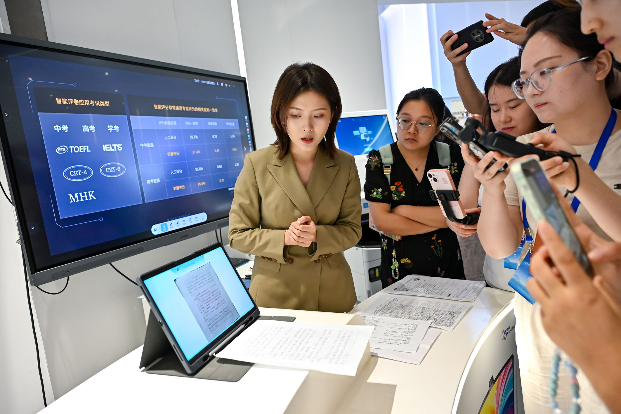 一名工作人員在科大訊飛人工智能體驗(yàn)館介紹AI學(xué)習(xí)機(jī)的批改作業(yè)功能。新華社記者 張鋮 攝