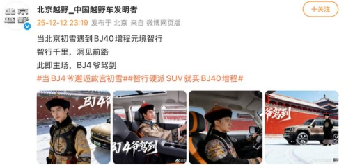 北京越野的宣傳海報(bào)顯示,身著清宮服飾、梳長辮的模特與BJ40越野車在故宮紅墻雪景前合影,配文“此即主場,BJ4爺駕到”。該設(shè)計(jì)本欲借“BJ40”諧音塑造“四爺”尊貴形象,然而公眾對此卻并不“買賬”。