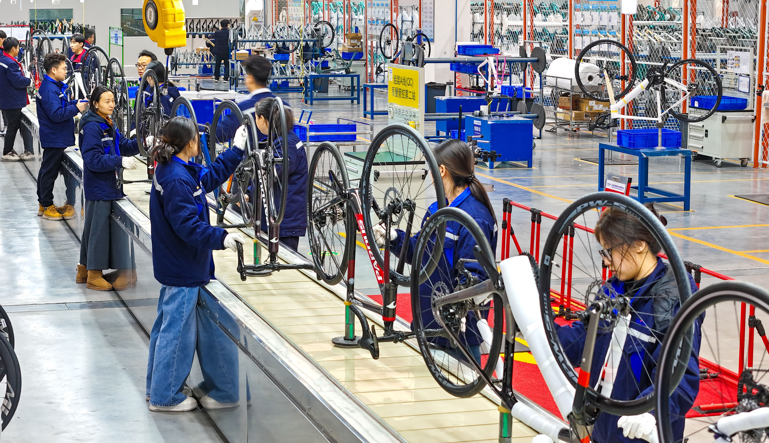 山東省樂陵市近年來聚力發(fā)展體育產(chǎn)業(yè),借助科技創(chuàng)新和標(biāo)準(zhǔn)研究,不斷提高產(chǎn)品在國內(nèi)外市場(chǎng)上的競(jìng)爭(zhēng)力、影響力,為國內(nèi)外重大賽事提供器材支持和專業(yè)服務(wù)保障,形成頗具規(guī)模效益的體育裝備產(chǎn)業(yè)集群。圖為在位于山東德州樂陵市的泰山體育產(chǎn)業(yè)集團(tuán)有限公司的生產(chǎn)車間,工人在組裝運(yùn)動(dòng)自行車(無人機(jī)照片)。