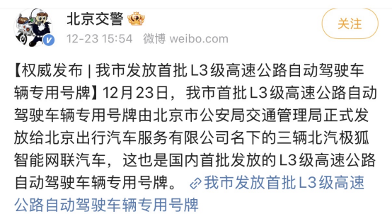 據(jù)@北京交警微博消息,12月23日,北京市首批L3級高速公路自動駕駛車輛專用號牌,由北京市公安局交通管理局正式發(fā)放給北京出行汽車服務有限公司名下的三輛北汽極狐智能網(wǎng)聯(lián)汽車,這是國內(nèi)首批發(fā)放的L3級高速公路自動駕駛車輛專用號牌。這標志著我國自動駕駛車輛從測試示范邁入正式量產(chǎn)階段,率先開啟L3級自動駕駛時代,成為汽車智能化進程中的里程碑事件。