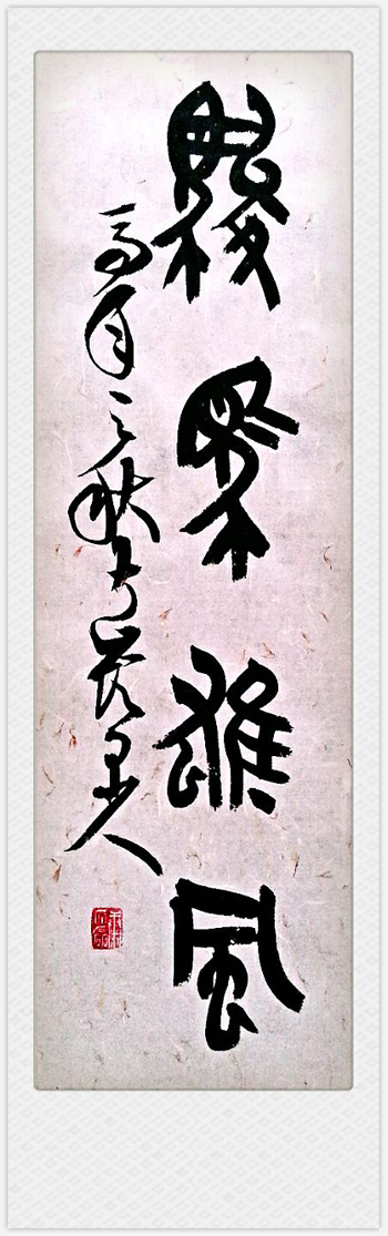 運筆或順或逆,或潤或澀,或俯或仰,或放或收,徘徊且馳騁,逐漸形成了自己筆法剛?cè)嵯酀误w方圓兼?zhèn)洌條瀟灑恣肆,布局嚴(yán)謹(jǐn)沉穩(wěn),章法氣脈貫通,意境高遠(yuǎn)宏闊的藝術(shù)特色。從而,他完成了由羨書、習(xí)字到精研深悟的過程,并靠著自己的勤奮與靈氣,一步一個腳印地接近自己對書法藝術(shù)追求的目標(biāo),一次次艱難而充滿自信地圓著自己人生的夢……