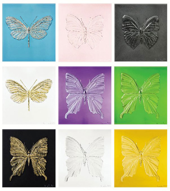 達(dá)米恩·赫斯特:我視蝴蝶為靈魂,也是廣泛被使用的世界視覺語言。我經(jīng)常形容蝴蝶是宇宙的啟發(fā)者,每一個(gè)人都會(huì)愛上它那不可思議的脆弱美態(tài)。對(duì)我來說,蝴蝶另一個(gè)吸引的元素,就是那種介乎于生日賀卡上被大眾喜愛的形象、愛的力量,以及昆蟲本身真實(shí)存在的矛盾張力。我們往往嘗試?yán)米匀粊肀磉_(dá)一些難以言傳的意念:愛、欲望、信念和永恒,蝴蝶正好是一個(gè)有趣的例子。其實(shí)這些都是既定的意念,基督教便經(jīng)常利用蝴蝶來表現(xiàn)復(fù)活;古希臘用來代表靈魂。我最喜愛蝴蝶無論生前死后都是一模一樣,但當(dāng)光線穿透這些版畫時(shí),它們就像以另一種形態(tài)復(fù)活了。
