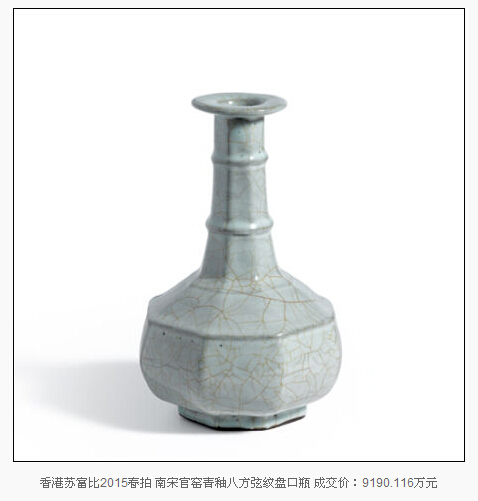 2015年已經(jīng)過半,藝術市場上各大拍行春拍也相繼收槌。瓷器板塊,香港蘇富比春拍一件南宋官窯青釉八方弦紋盤口瓶以1億1388萬港元(約合9190萬人民幣)的成交價占據(jù)2015上半年的排行榜頭名,這一價格也成為宋代瓷器歷史第三高拍賣成交價。高古瓷器的市場走高也被相當一部分業(yè)內人士認為是古瓷市場回歸理性的征兆。